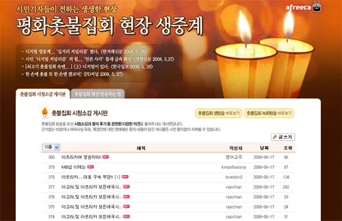 여러가지 정치적 해석이 나오겠지만 무엇보다 2008년 촛불을 아우르는 핵심 키워드는 역시나 인터넷이다. 우리나라 최초의 촛불 시위는 1992년 한국통신이 인수한 PC통신 코텔을 하이텔로 바꾸면서 유료화하려 하자 한 이용자의 제안으로 촛불 집회가 일어난 것을 시초로 본다. 대한민국 최초의 촛불 시위의 주제가 바로 PC통신이었다는 사실이 참 재미있지 않은가?