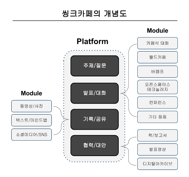 우리는 이렇게 씽크카페라는 플랫폼 위에서 작동하는 대화, 기록, 공유, 협력의 다양한 방법들을 조사하고 실험하고확산시켜보려고 합니다. 그래서 사람들이 특정한 주제로 씽크카페를 개최해보고자 한다면 주제와 지역, 참여자들의 상황에 맞게 여러가지 모듈(방법)들을 조합해서 가장 적절한 진행방법을 찾을 수 있기를 기대하고 있습니다.