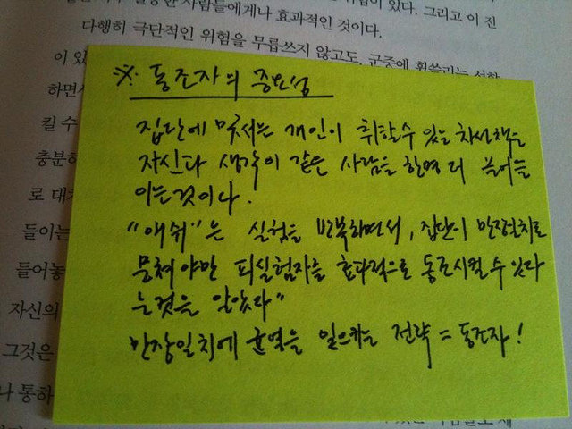 이 실험에 관한 내용을 읽으면서 우리가 조직 내에서 의사결정을 할 때 모두의 입장과 다른 입장을 설파하는 사람을 함부로 내쳐서는 안될 근거를 찾아봅니다. 또 우리가 그 당사자가 되어 집단에 굴복해야만 하는 상황이 되었을 때 혹은 집단으로부터 압력을 받을 때 취할 수 있는 차선책은 그 집단의 결정에 함께 균열을 일으킬 수 있는 한 사람의 동조자를 구하는 것이 중요하다는 사실도 알게 되었습니다.