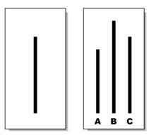 옆 그림처럼 왼쪽 선과 똑같은 길이의 선을 고르는 아주 쉽고 단순한 문제입니다. 집단에 동조하는 개인의 모습은 앞선 참여자가 모두 정답을 C라고 답하지 않고 A라고 답했을 때 나타난다고 합니다.