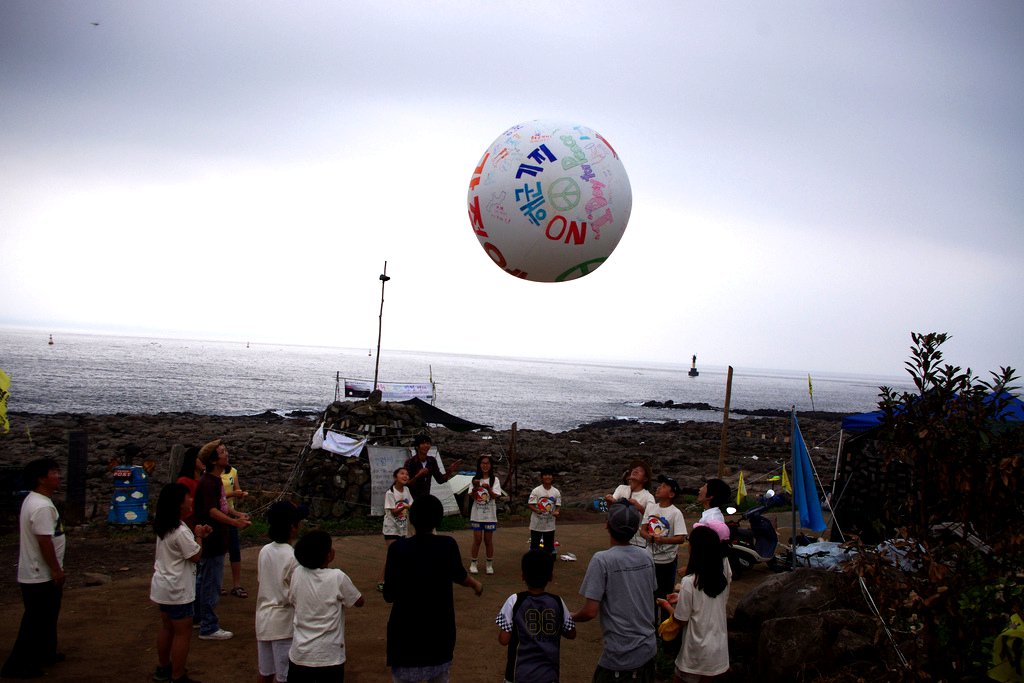 서로 원을 그려서 실로 거미줄을 만들더니 그 위에 애드벌룬을 띄우는 평화행동.