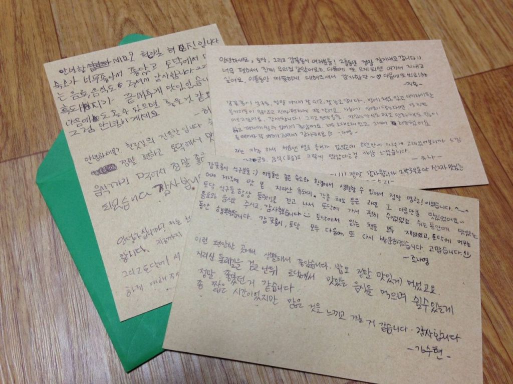 제주에서 지리산으로 여행온 아이들, 곶자왈작은학교의 청소년모임 천리길. 제주 살때의 인연이 있어서 저녁에 고기를 구워줬다. 이틀동안 둘레길을 걷고 나서 지리산문화공간 토닥에서 한두시간 정도 만화책 보고 쉬었다가 감꽃홍시 숙소로 가서 저녁프로그램을 진행하고… 오늘 아침에 곡성쪽으로 떠난다 했는데 늦잠자느라 인사를 못했다. 근데 숙소에 저렇게 한명한명이 편지를 써서 놓고 갔다… 작년에도 지리산쪽에 여행을 왔는데 이 친구들은 말하는 것, 노는 것, 생각하는 것까지 참으로 착하고 기특하다. 어떨때는 멋지기까지 하다. Yong Po Moon샘과 좋은 여행하고 행복한 추억만들고 제주로 가길!