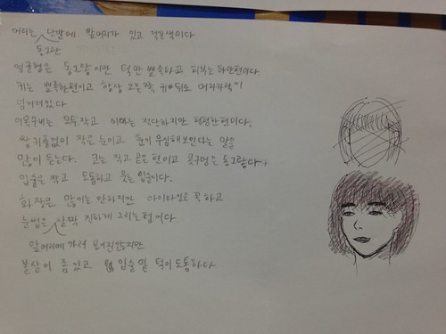 - 우선 A4용지를 한장씩 나눠준 다음 자신의 얼굴을 최대한 상세하게 “글”로 설명하게 한다.