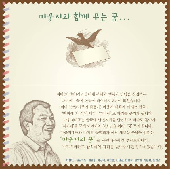 함께하는 시민행동에서 마웅저를 만난게 벌써 10년이 넘었나봅니다…. 마웅저가 집으로 간다네요.. 우리나라도 과거, 군부독재의 억압을 피해 해외에 살 수밖에 없었던 사람들이 있었죠. 마웅저도 그런 어려운 시기를 겪었을거예요… 이제 마웅저의 고국땅 버마로 돌아가셔서 한국사회에서 경험한 것들을 바탕으로 여러 좋은 일들을 벌이실 계획이라고 하니 정말 축하할 일입니다…. 마웅저 축하해요!~ 한국에서의 좋은 추억만 가지고 가시길… 거기서도 행복하게 일하시구요…! 인연, 감사했습니다.