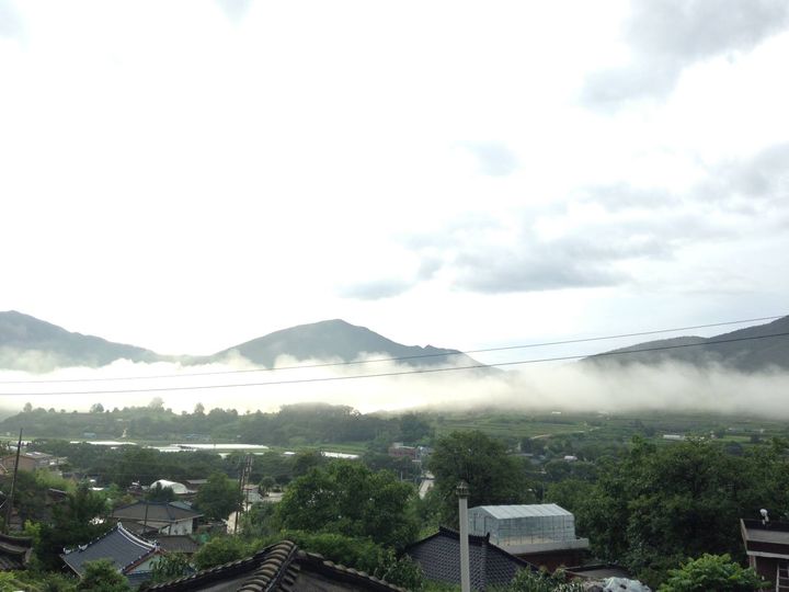 잠은 깨버리고 잠깐 마당에 나갔더니 비는 그치고 구름이 낮게 깔렸다. 깨끗한 초록 색깔들로 주변에 청명한 기운이 도는 초복날이다.