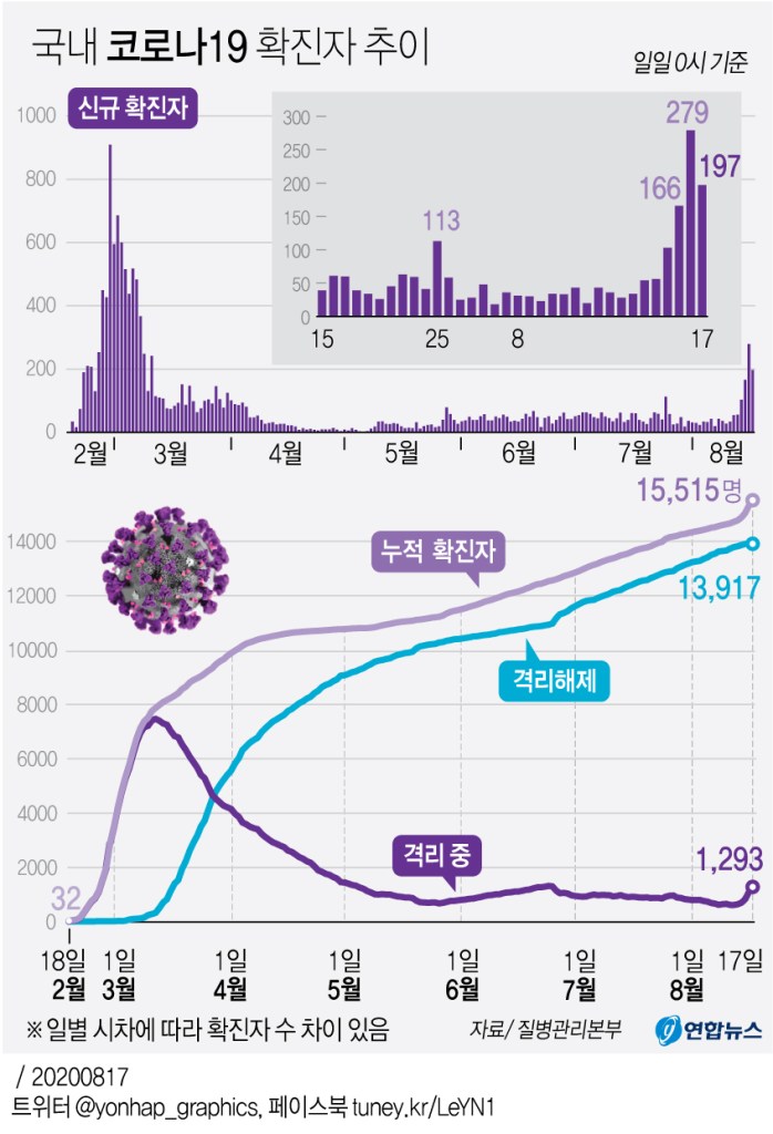 이 통계를 기초로 추측해보면 현재 8월 중순의 이 상황이 조금은 진정될 기미가 보일 것으로 예상되는 시점은 9월 중순, 그리고 2주 후 9월 말에는 50여명 아래로. 그리고 2주 후 10월 중순에는 안정세로 접어들 것으로 추측해볼 수는 있을 것 같다. 하지만 현재는 신천지보다 더 심각한 상황이라고 한다. 10월 행사, 가능할 것인가? 확실히 불확실성의 시대로 진입한 것 같다.
