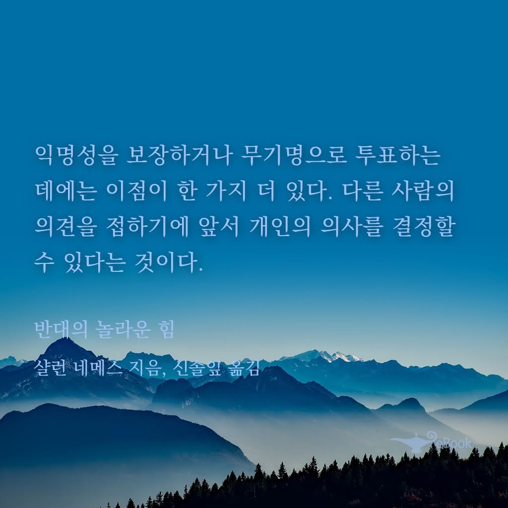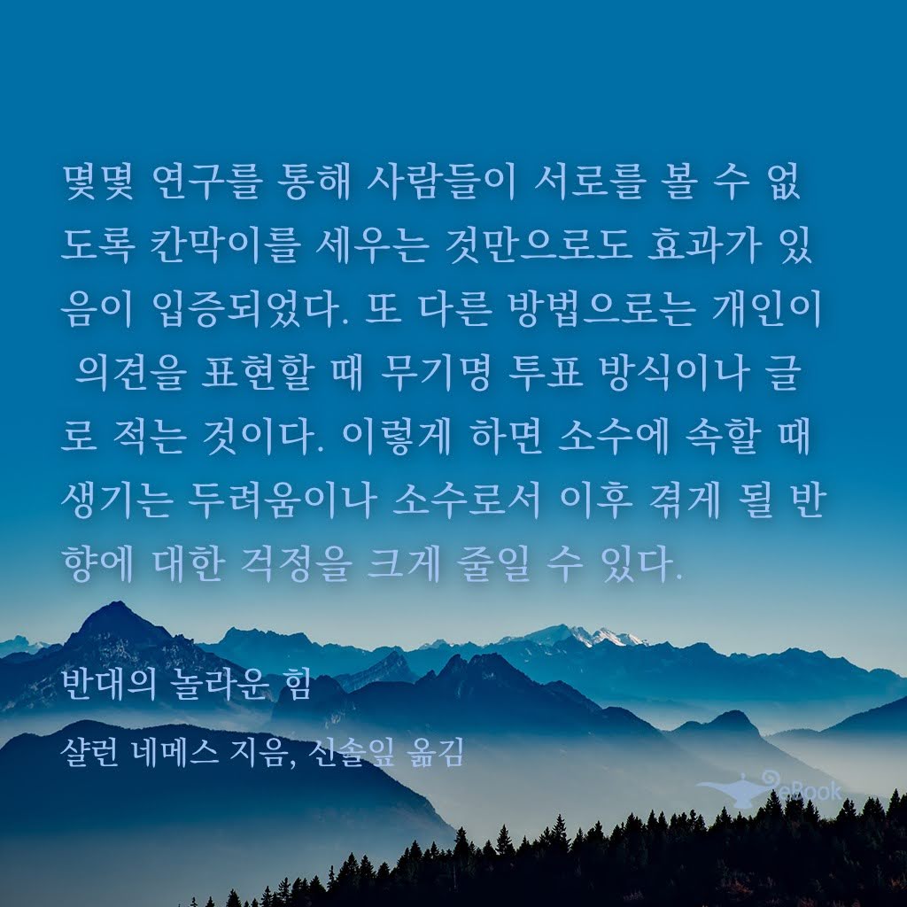 <반대의 놀라운 힘>이라는 책에서도 비슷한 이야기가 나왔다. 의견 표명을 할 때 돌아가면서 하게 될 경우 앞 사람의 의견, 그 중에서 다수의 의견에 더 영향을 받게 된다는 이야기였다. 한 사람이 다수의 의견에 반하는 의견을 내기 얼마나 어려운지를 설명하고 있긴 했지만 인상깊었던 것은 바로 위 구절이다.
