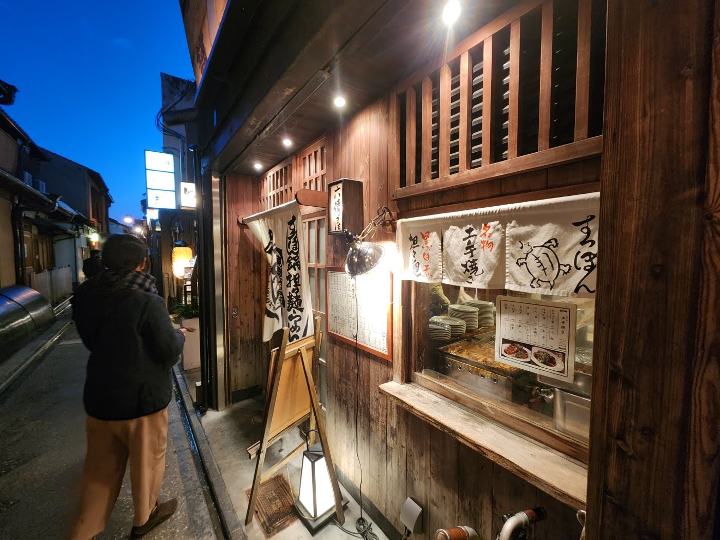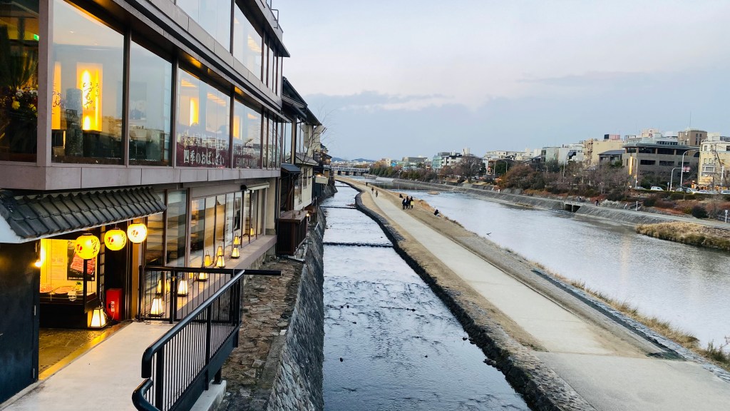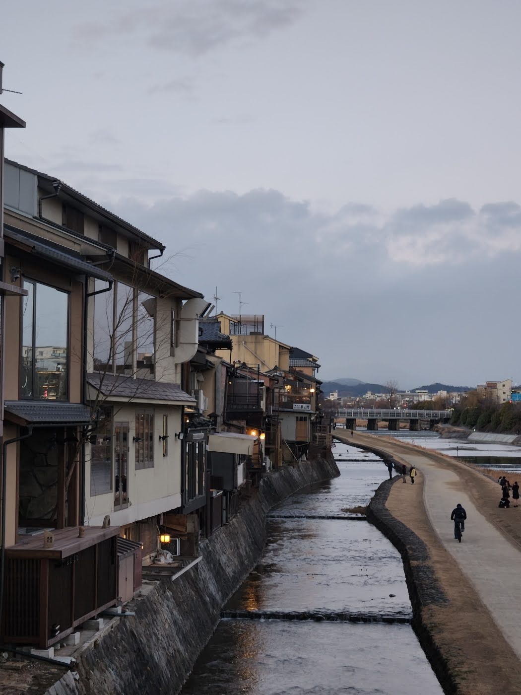 첫날 저녁, 교토 시내 중심부를 흐르는 카모강(鴨川) 근처의 식당을 찾았다. 카모강은 그리 큰 강은 아니다. 도림천이나 중랑천 정도의 느낌이랄까. 강둑에는 산책로가 정비되어 있고, 강가를 따라 오래된 가옥들이 자리를 잡고 있고, 그곳에는 밥과 술을 파는 선술집들이 쭈욱 펼쳐져 있어서 야경이 멋진 곳이다. 추운 겨울 날씨라 사람이 없었지만 따뜻한 계절에는 강둑 산책로를 따라 휴식을 즐기는 사람들이 꽤 많다고 한다.