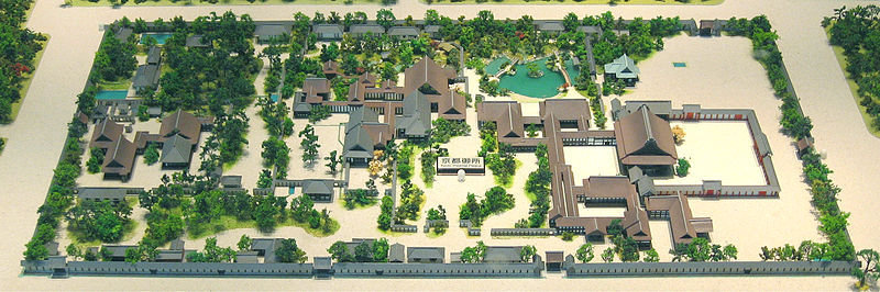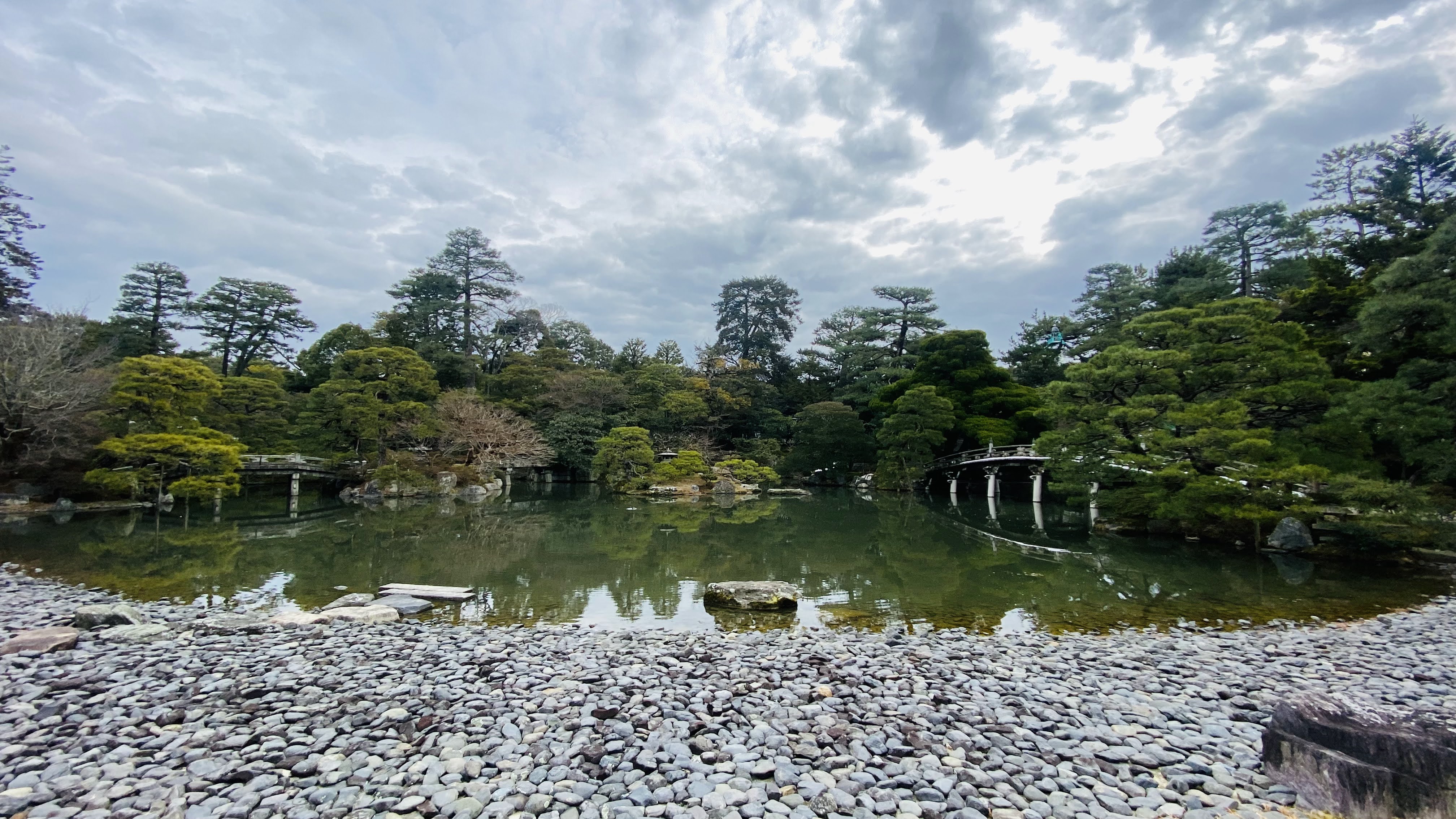 위 사진에 보이는 담 안쪽이 교토교소(京都御所)이고, 아래 이미지가 교토교소 내부를 표현한 것이다. 교토교소를 둘러싸고 있는 공원 이름이 교토교엔(京都御苑)이다. 메이지 유신 이후 도쿄로 수도를 이전한 후 이곳에 남아있던 저택들이 빈집이 되면서 교소 주변이 황폐해져가는 것을 그대로 방치할 수 없어서 이후에 화재예방과 경관조성을 목적으로 조성한 공원이다. 동서로 700미터, 남북으로 1,300미터에 달하는 총면적 92헥타르(약 28만평)의 큰 공원이다.