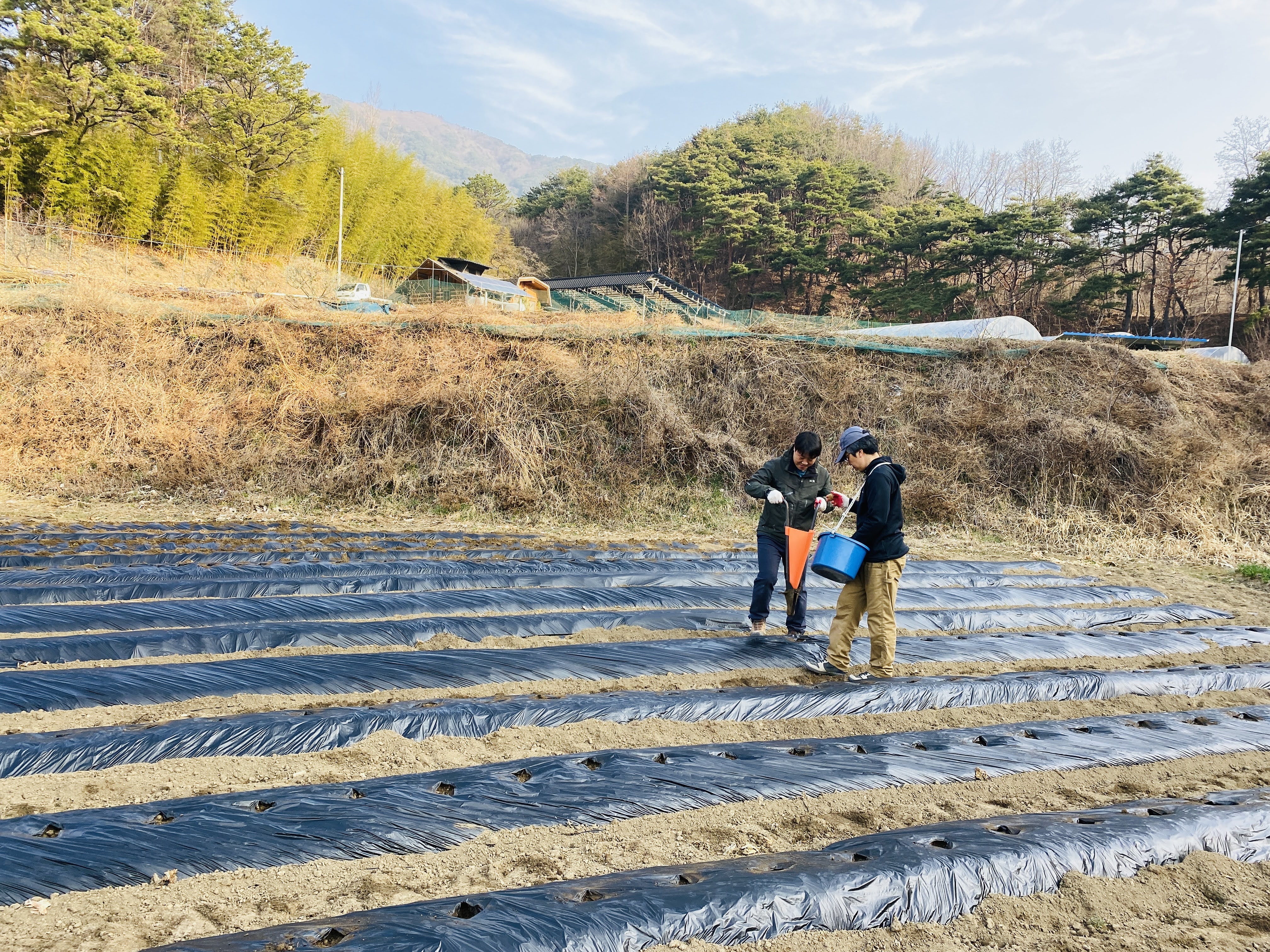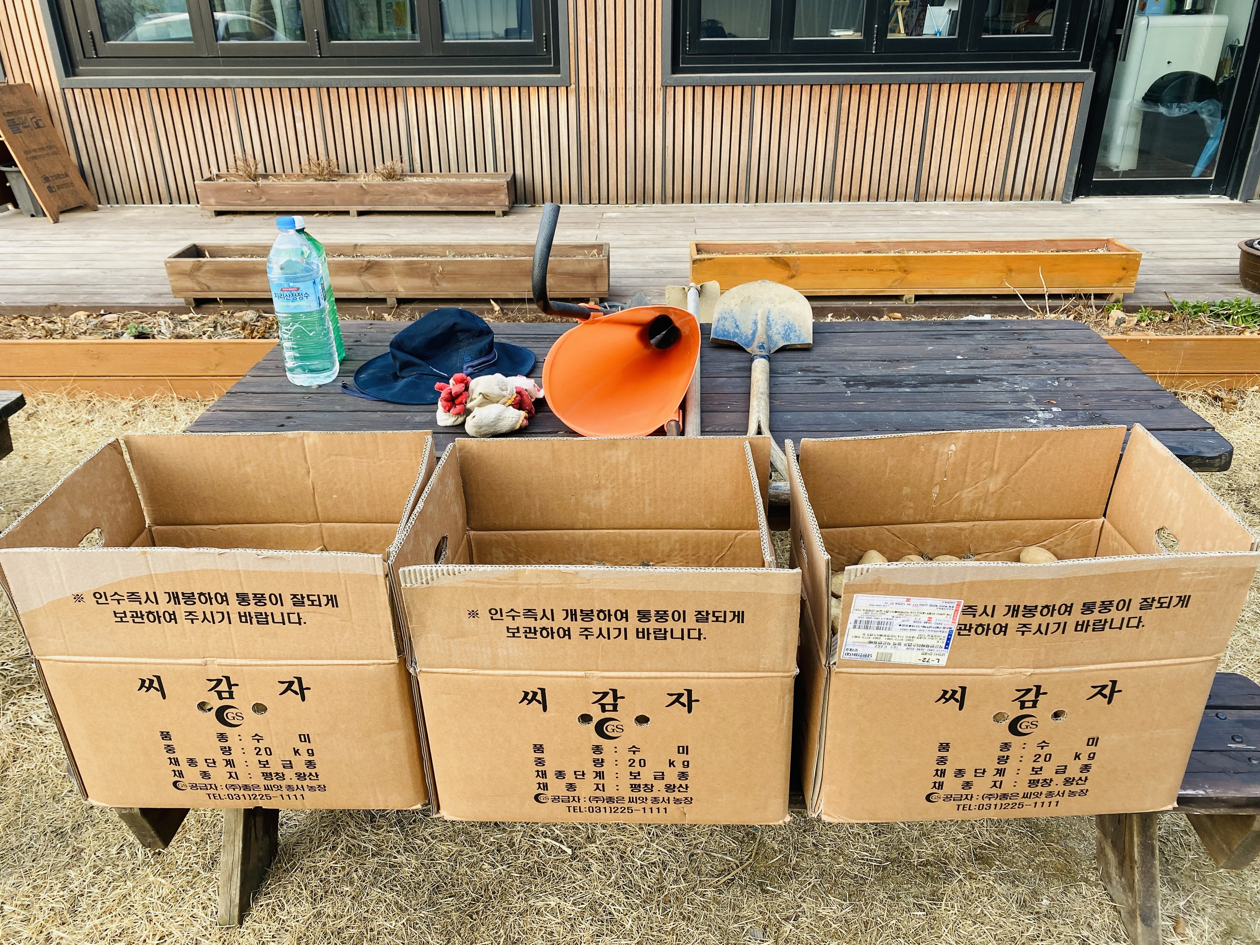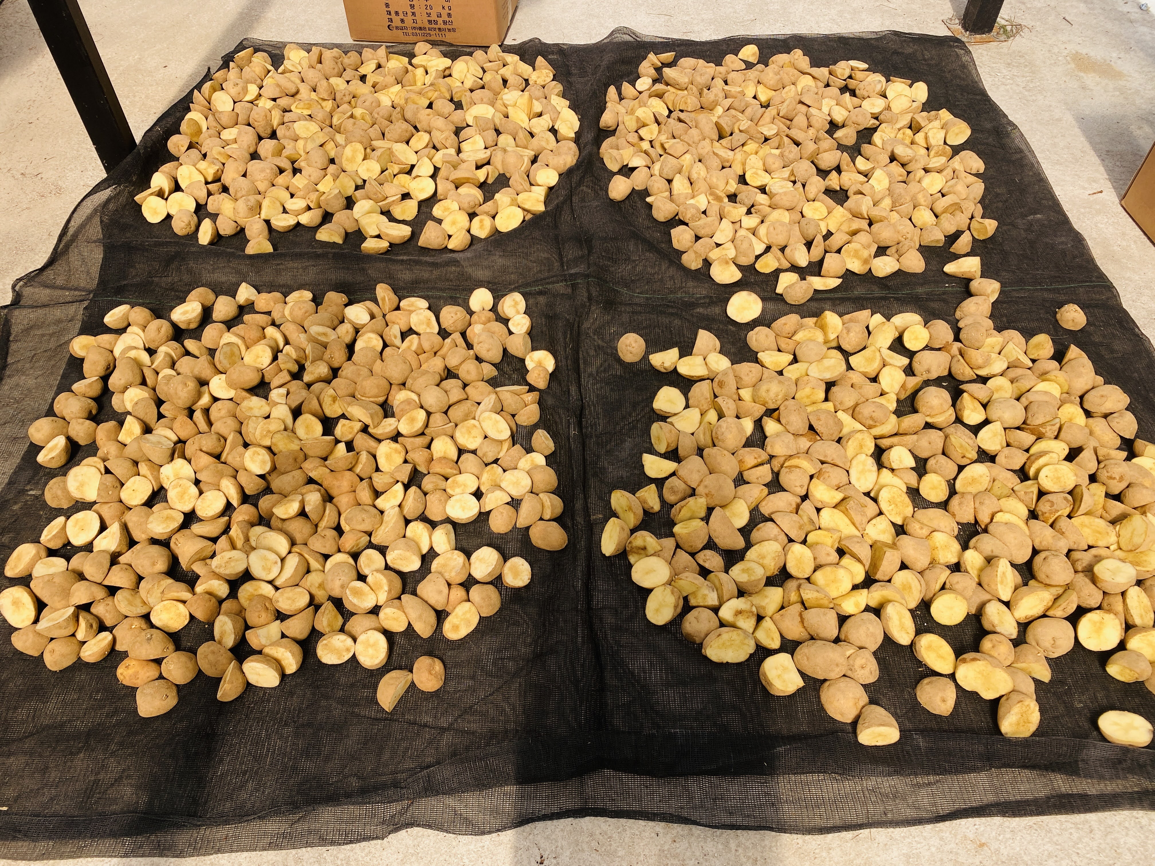 두 곳의 감자밭을 3인 1조로 6명이 오전에 끝냈다.