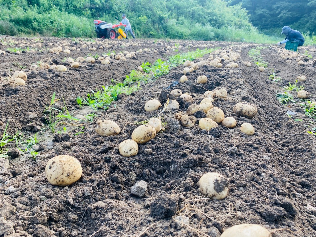 매년 감자를 심었는데 올해는 초기에 풀도 잘 잡고, 너무나 완벽하게 싹들이 다 올라와서 기대를 했다. 하지만 4월 말에 뒤늦게 내린 서리로 인해 감자싹들이 다 얼어서 죽어버리면서 좌절. 다행히도 새로 나오기 시작한 싹들이 알을 키워서 지금의 감자를 만들었다. 알이 작지만 쩌먹는 용도로는 딱 적당한 한 입 크기. (거름을 좀 더 많이 했어야 했다.) 그렇게 위안을 삼으며 올해 농사 첫 수확.