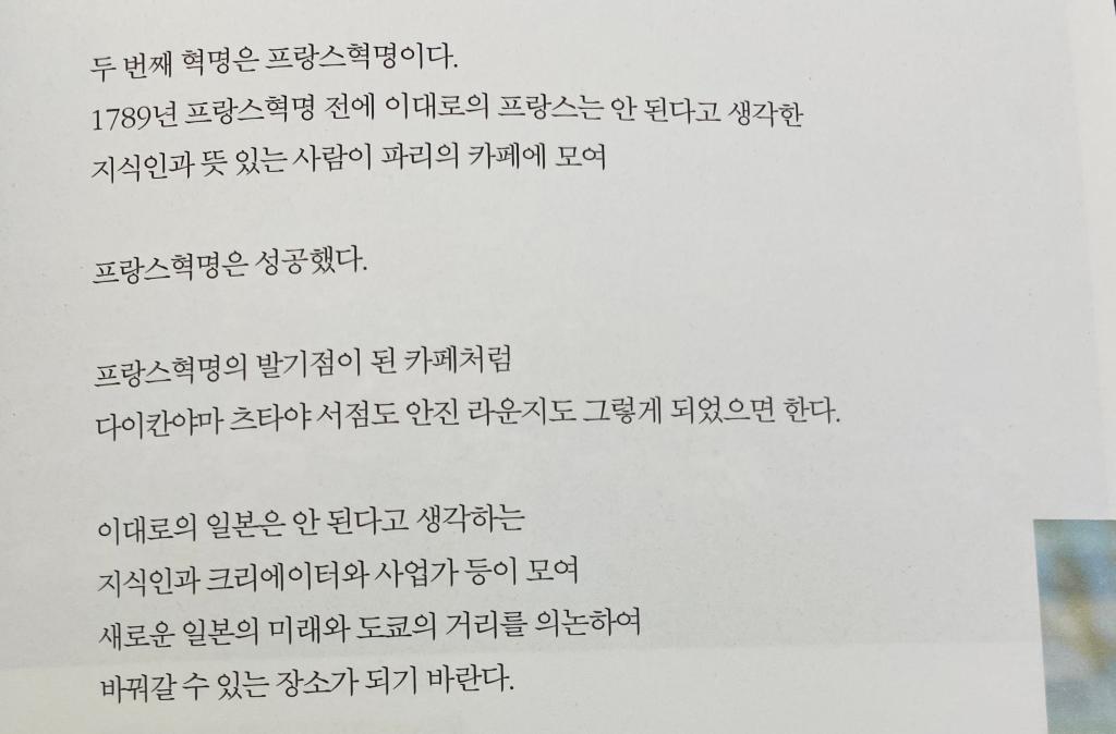 두번째 혁명은 프랑스 혁명이다. 1789년 프랑스혁명 전에 이래로의 프랑스는 안 된다고 생각한 지식인과 뜻있는 사람이 카페에 모여 프랑스혁명은 성공했다. 프랑스혁명의 발기점이 된 카페처럼 다이칸야마 츠타야 서점도 안진 라운지도 그렇게 되었으면 한다.