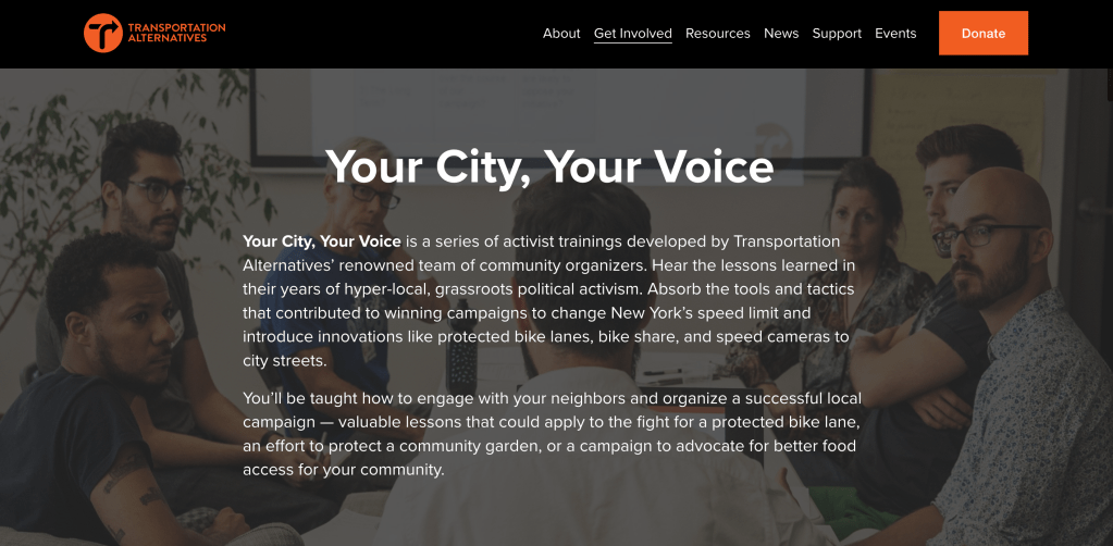 뉴욕의 제한속도를 변경하고 자전거 전용도로, 자전거 공유, 과속 단속 카메라 같은 혁신을 도시의 거리에 도입하기 위한 캠페인에서 승리하는 데 기여한 도구와 전술을 알려준다. 또 이웃과 소통하고 성공적인 지역 캠페인을 조직하는 방법을 배우게 되며, 자전거 보호 도로를 위한 투쟁, 커뮤니티 가든을 보호하기 위한 노력, 지역사회를 위한 더 나은 음식 접근성을 옹호하는 캠페인에 적용할 수 있는 귀중한 교훈을 얻을 수 있다. 이 프로그램의 세 가지 시리지는 아래와 같다.