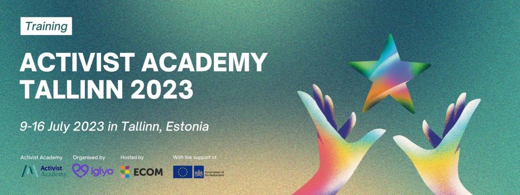 <활동가 아카데미 2023>은 에스토니아 탈린에서 IGLYO 회원사인 ECOM이 주최한다. 참가자들은 2023년 7월 9일 일요일에 도착하여 2023년 7월 16일 일요일(또는 2023년 7월 15일 토요일 저녁)에 떠날 예정이다. 아카데미는 총 6일간 진행된다. 활동가 아카데미 참가비는 개인당 50유로이다. 참가와 관련된 모든 비용(여행, 숙박, 식비)은 IGLYO에서 부담한다. 숙소와 식사는 IGLYO에서 제공한다. 그러나 참가자는 직접 여행을 예약해야 할 책임이 있다.