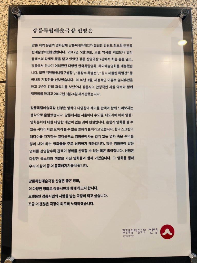강원도의 유일한 독립영화관, 신영독립예술극장은 강릉에 있다. 극장을 운영하는 곳은 비영리단체 ‘강릉시네마떼끄’다. 강릉 영화계의 역사라고 할 수 있는 ‘신영극장’은 1960년대 초반부터 운영했는데 꽤 오랫동안 강릉 시민들의 단골 약속장소이기도 했다. 하지만 다른 지역과 마찬가지로 멀티플레스의 확산으로 운영에 어려움을 겪어 2009년에 문을 닫았다. 이를 안타까워하는 강릉 시민들의 노력으로 2012년에 독립-예술영화 전용 극장으로 재개관을 했다.