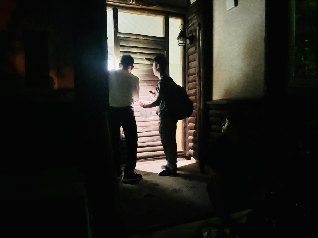 아래 사진은 우리를 기다리던 펜션 관리인이 숙소 문을 열지 못해서 헤매는 모습이다. 번호키가 있는 문이었는데 번호를 종이에 써서 인수인계해주는 것도 신기했지만 심지어 그 번호가 맞지도 않아서 한참을 밖에서 기다릴 수밖에 없었다. 번호를 다시 확인하고 하는데 10분 이상 걸렸고, 결국에는 열쇠로 문을 열어줬다. 이럴거면 왜 번호키를 달아놨는지. 여하간 일본은 오면 거리, 풍경, 집 등이 모두 볼만하고 상쾌한 기분이 들지만 이해되지 않는 것들이 많은 나라다.