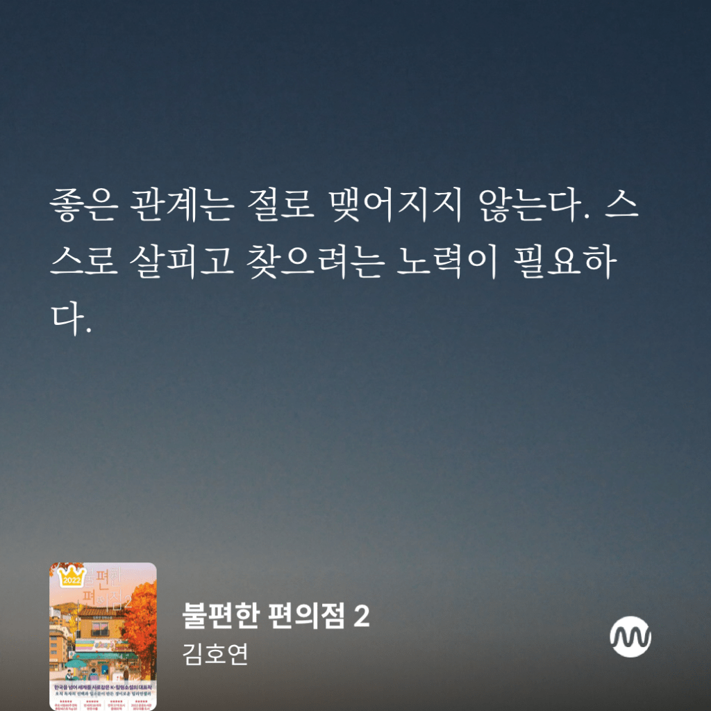 소설 속 장소, 풍경, 인물, 시대적 배경이 내가 아는 것과 겹치면 좀 더 몰입하게 된다. 불편한 편의점, 두번째 이야기도 그렇게 시작했고, 단숨에 읽었다. 도심 속 저마다의 아픈 사연이 있는 사람들이 살아가는 따뜻한 이야기. 이렇게 일상의 이야기를 인물의 서사와 함께 스토리로 써내려가는 것이 작가의 능력이겠지. 그 많은 문장 중에 기억하고 싶은 한 문장.