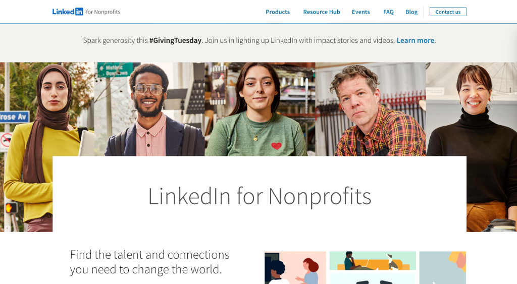 특히 링크드인에는 비영리 단체를 위한 LinkedIn for Nonprofits라는 특별 프로그램이 있다. 이 서비스를 통해 비영리 단체들은 더 효과적으로 인재를 모집하고, 잠재 기부자 및 지지자와 연결하며, 조직의 사명을 알릴 수 있는 다양한 지원과 혜택을 받을 수 있다. 홈페이지에 소개된 비영리 링크드인의 몇 가지 서비스와 특징을 살펴보면 아래와 같다.