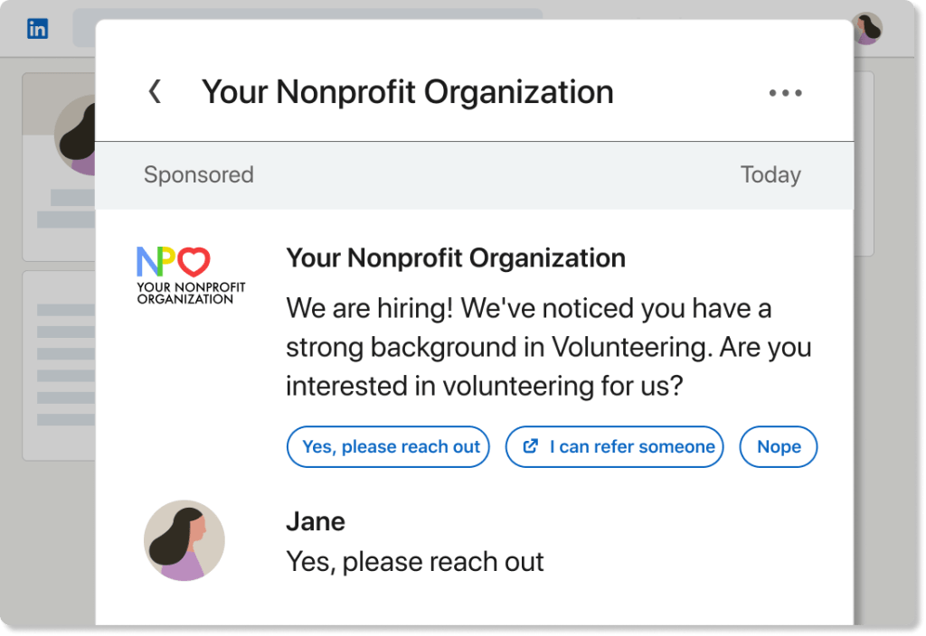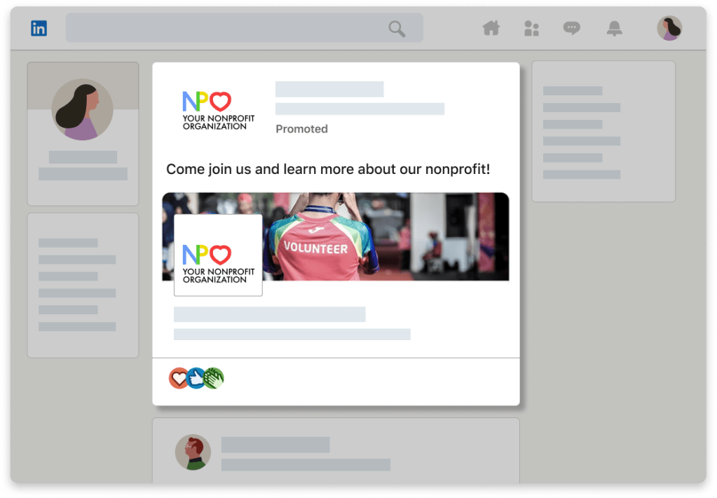 비영리 링크드인은 단체가 브랜드를 구축하고, 영향력을 확장하며, 새로운 기부자, 자원봉사자, 후원자, 인재를 확보할 수 있도록 돕는다. 특히, 링크드인이 제공하는 유료 광고 제품은 다음과 같은 방식으로 단체의 목표 달성을 지원한다.