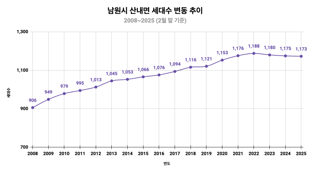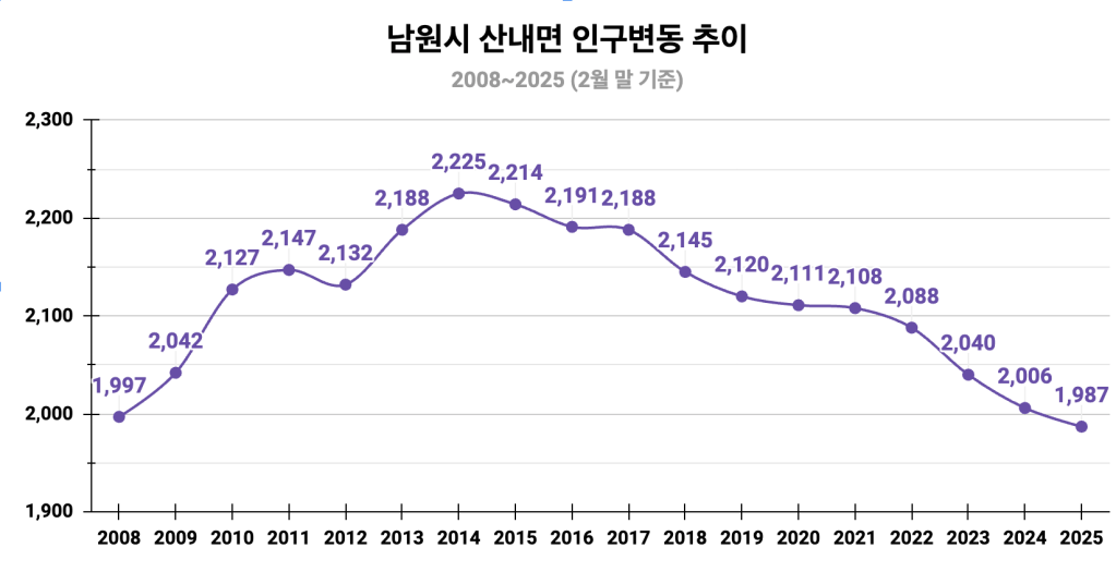 - 2025년 2월 현재, 남원시 산내면 인구는 1,987명이다.