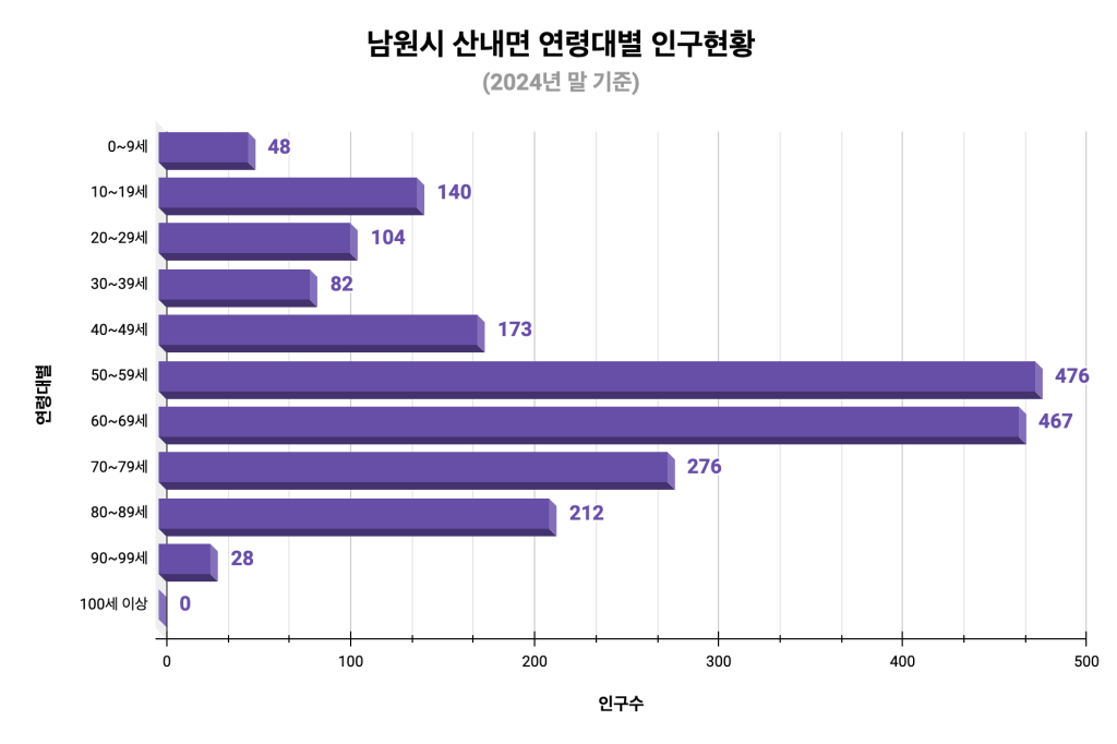 - 산내면의 연령대별 인구수는 50대가 476명(23.7%)으로 가장 많다.