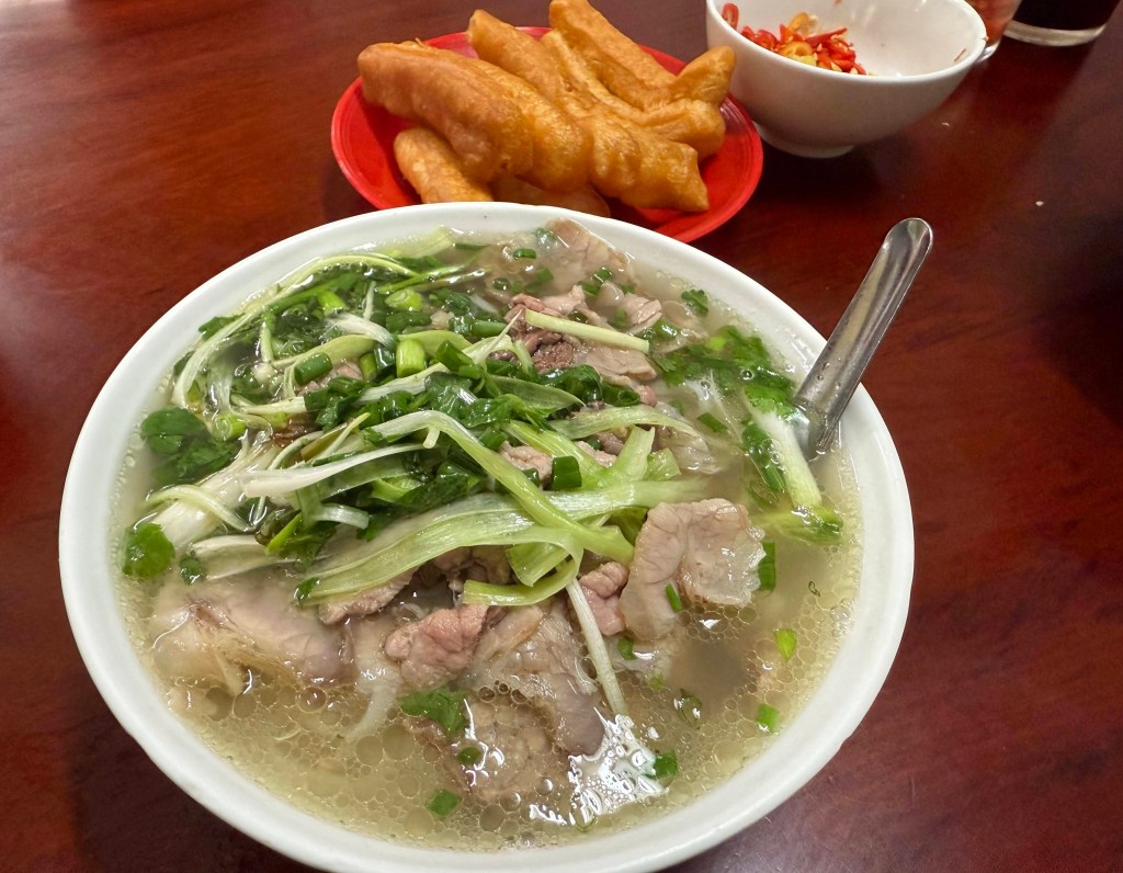 쌀국수 한 종류만 파는데 고기 익힘 정도에 따라 세 가지 옵션이 있다. 추가로 ‘꿔이’라고 불리는 튀긴 빵을 주문할 수 있는데, 쌀국수 육수에 찍어먹는다. 이곳 쌀국수의 가장 큰 특징이자 매력은 아주 진한 국물이다.