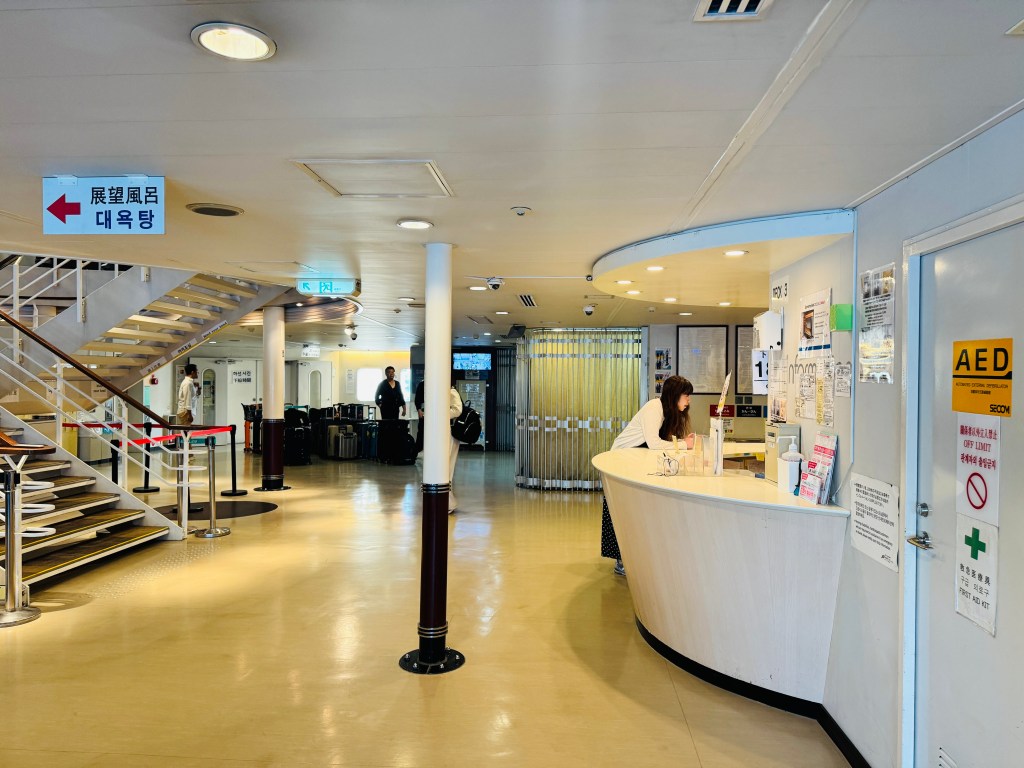 - 저녁 6시 30분부터 탑승하고, 8시에 출항이라고 되어 있는걸로 착각을 하는데, 실제 출발시간은 저녁 10시이다. 8시에 탑승을 마감하고 2시간 동안 부산항에 대기한다.