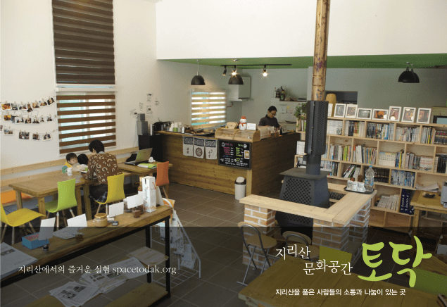 2년 전, 내가 살고 있는 지리산 자락 시골 마을(남원시 산내면)에 문을 연 <마을카페 토닥>은 이렇게 마을 사람들의 사랑방이 되었다. 물론 지리산을 찾는 여행객들에게는 둘레길을 걷다가 커피 한잔 하면서 잠시 쉬어가는 휴식공간이기도 하다. 처음 “지리산에서의 즐거운 실험”이라고 하면서 <지리산문화공간 토닥>이라는 단체를 만들고, 첫 프로젝트로 마을카페를 열겠다고 했을 때 시골에서 누가 커피를 사먹겠냐면서 주변의 걱정아닌 걱정도 많았다. 그럼에도 단순히 커피를 파는 곳이 아니라 마을에 문화와 예술의 향기를 퍼트리는 공간으로 만들어가보자는 이야기에 마을 사람들은 후원금을 내고, 건물을 수리하는데 재능을 기부하고, 정기 회원으로도 가입했다.