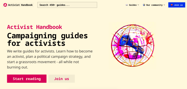 3억 5천만명의 활동가 양성을 목표로 세상을 바꾸는 활동가를 위한 핸드북을 위키백과 방식으로 제공하는 곳이 있다. Activist Handbook라는 이름의 이 플랫폼은 450개 이상의 활동 가이드와 470만개 이상 연결된 외부 정보를 찾을 수 있다. 이 플랫폼은 위키 방식으로 활동가를 위한 가이드를 작성한다. 활동가가 되는 방법, 정치 캠페인 전략을 계획하는 방법, 풀뿌리 운동을 시작하는 방법, 지치지 않으면서도 활동가가... Continue Reading →
