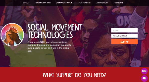 전 세계에서 활동하는 운동가들과 함께 소셜 무브먼트 테크놀로지(Social Movement Technologies, SMT)는 디지털 혁명의 최전선에서 정의를 추구하는 사람들의 연대를 강화한다. SMT는 전략 수립부터 교육 프로그램, 캠페인 지원에 이르기까지 다방면으로 그들을 돕는다. 특히 SMT가 비영리 기관이라는 점에서 그 의미는 중요하다. SMT의 모든 활동과 자원은 오롯이 운동가들의 필요와 목표 달성을 위해 사용된다. 이것은 SMT가 100% 운동 중심적인 가치... Continue Reading →